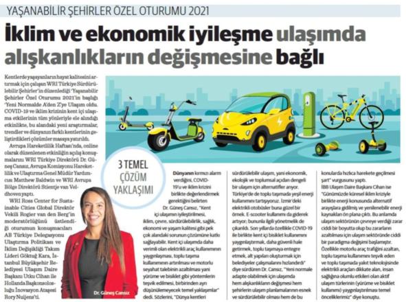 Kentlerde yaşayanların hayat kalitesini artırmak için çalışan WRI Türkiye Sürdürülebilir Şehirler'in düzenlediği 'Yaşanabilir Şehirler Özel Oturumu 2021'in başlığı 'Yeni Normalde A'den Z’ye Ulaşım’ oldu. COVID-19 ve iklim krizinin kent içi ulaşıma etkilerinin tüm yönleriyle ele alındığı etkinlikte, bu alandaki yeni araştırmalar, trendler ve dünyanın farklı kentlerinin geliştirdikleri çözümler masaya yatırıldı.